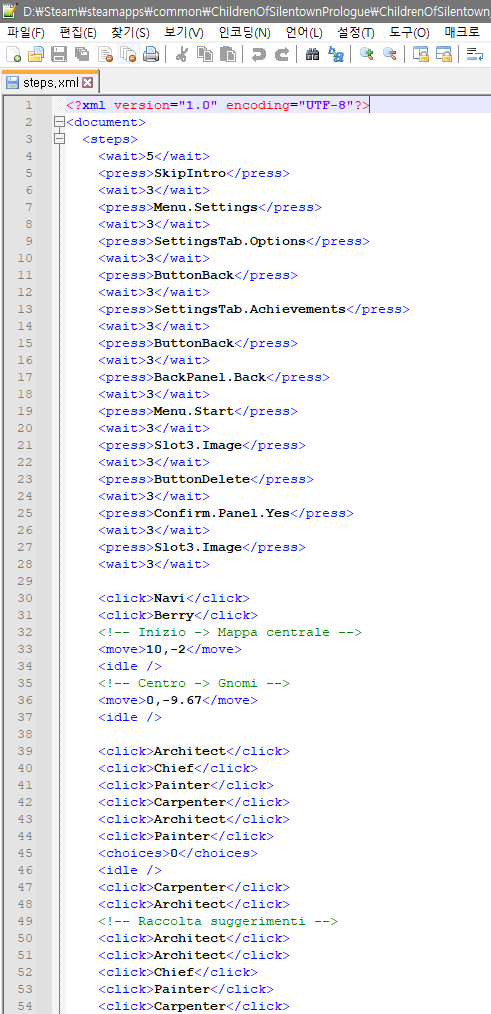호기심을 끊을 수가 없었던 필자가 게임해보고 그 안의 게임 데이터 파일을 이것저것 열람하면서 발견한 것 중 하나인데 xml 형식으로 된 파일을 그대로 Notepad++에 가져와 봤더니 이렇게 생겼습니다. 언뜻 보면 메뉴부터 시작해서 각 이름으로 되어있는 클릭 부분이 있다는 것을 발견할 수 있었습니다. (하지만, 아쉽게도 여기까지만 보여드립니다.)